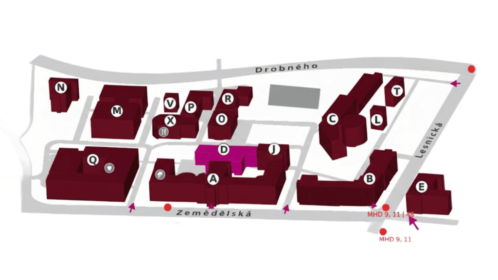 Kampus univerzity v Brně je dostupný tramvají č. 9 a 7, zastávka Zemědělská a trolejbusem č. 25 a 26, zastávka Lesnická.